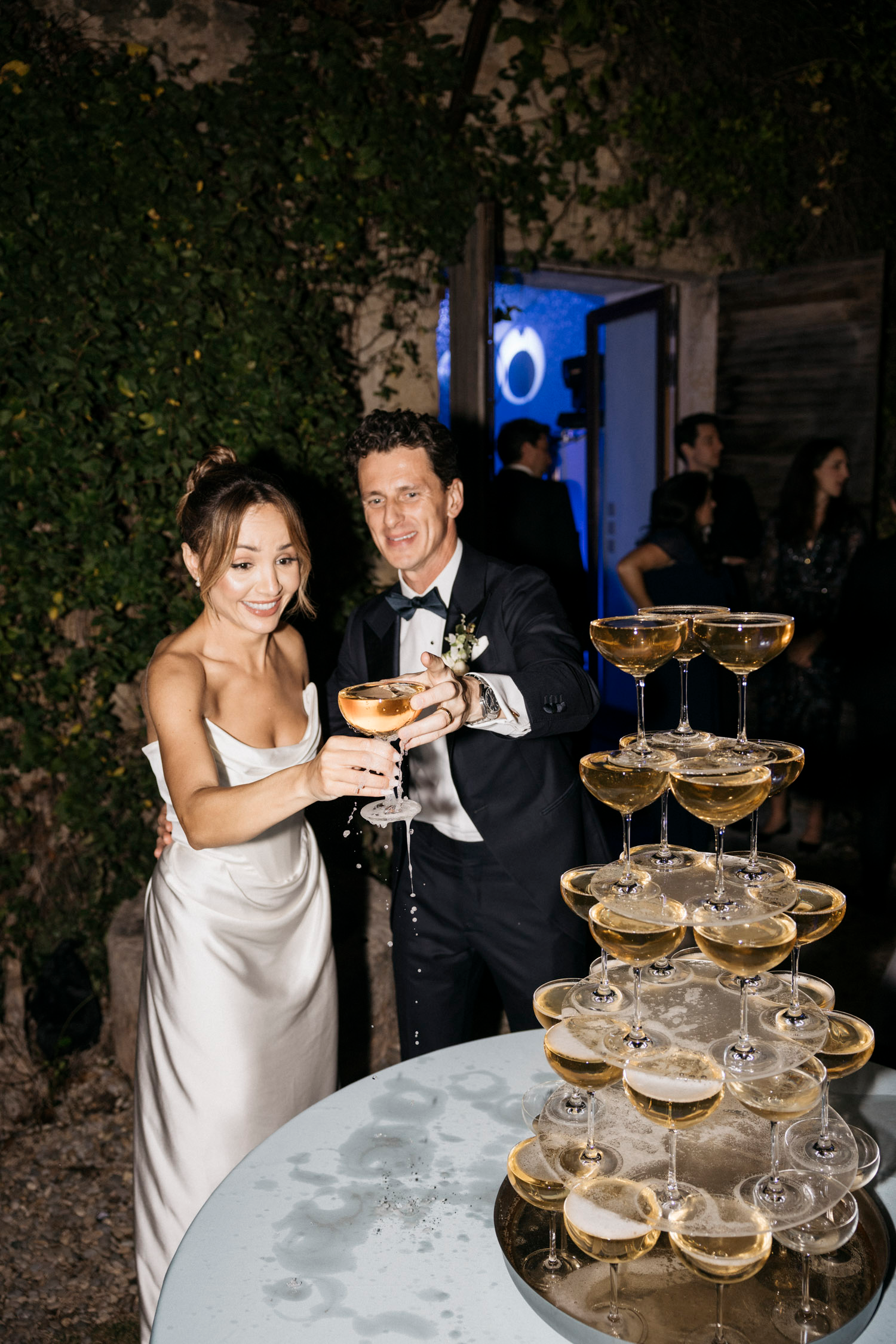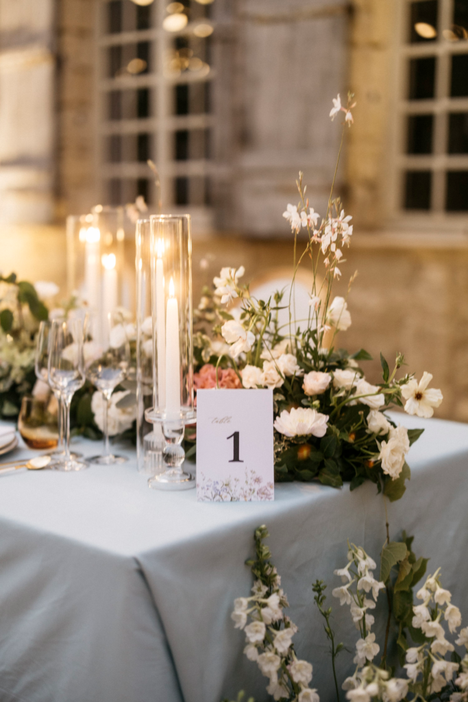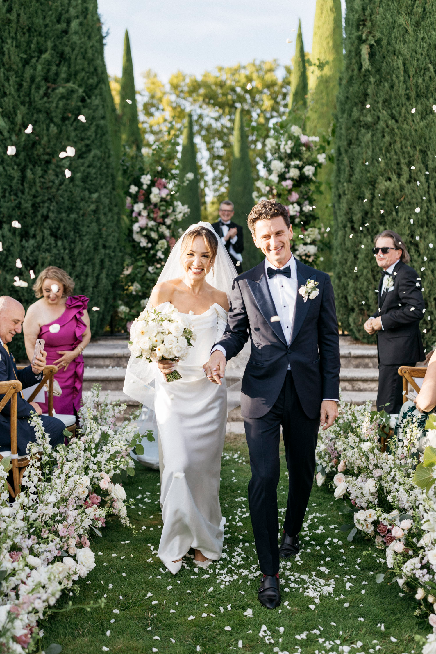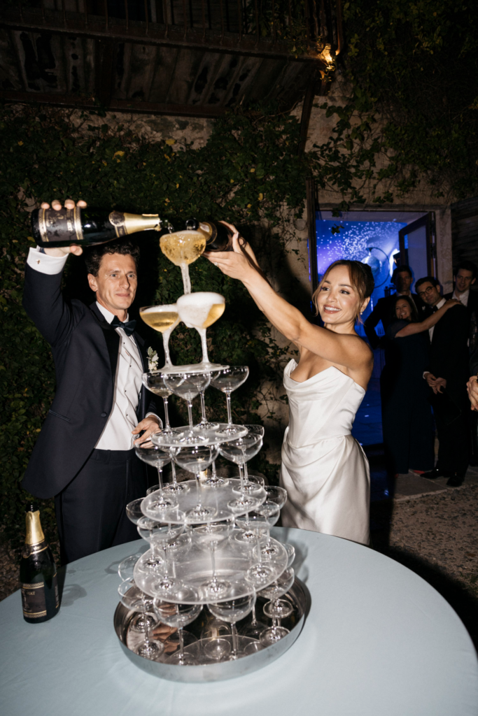 After the ceremony, guests moved to a terrace overlooking the sprawling vineyards. Tables adorned with flickering candles and arrangements of fresh Provencal flowers created an ambiance of rustic elegance. Laughter and clinking glasses filled the air as the newlyweds made their grand entrance, a symbol of the beginning of a new chapter in their lives.