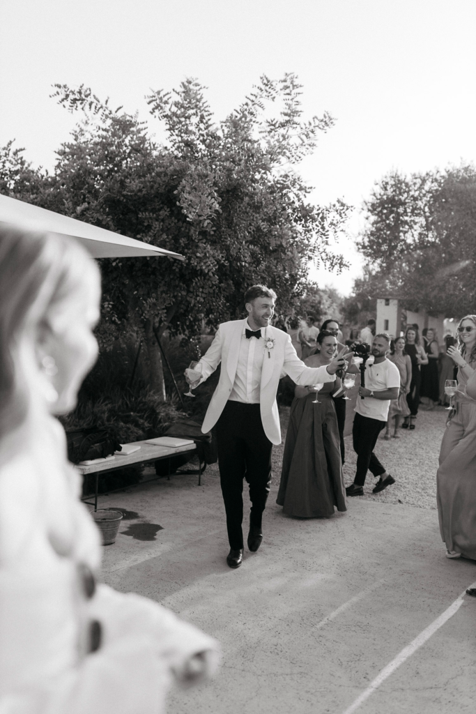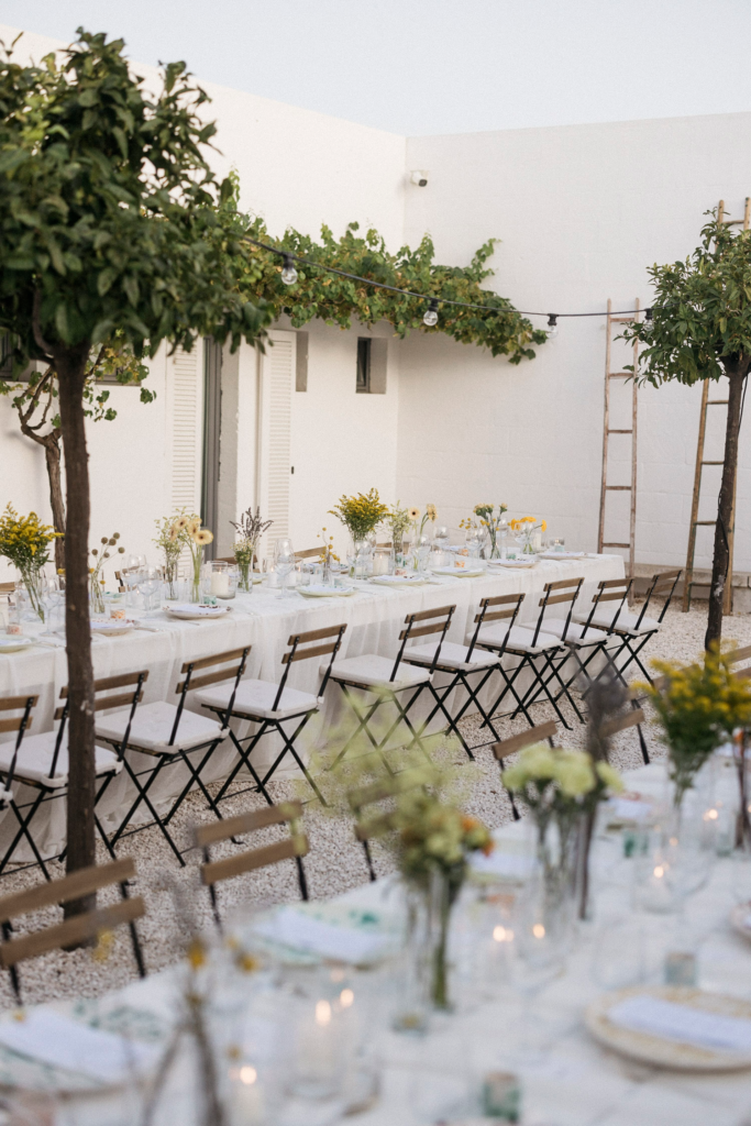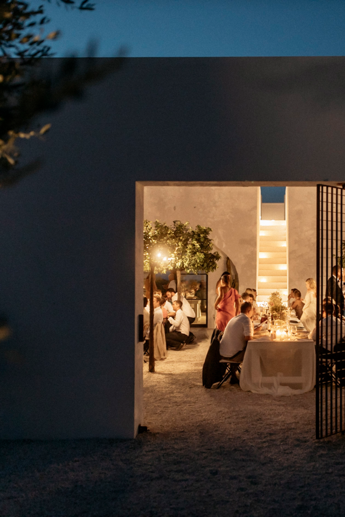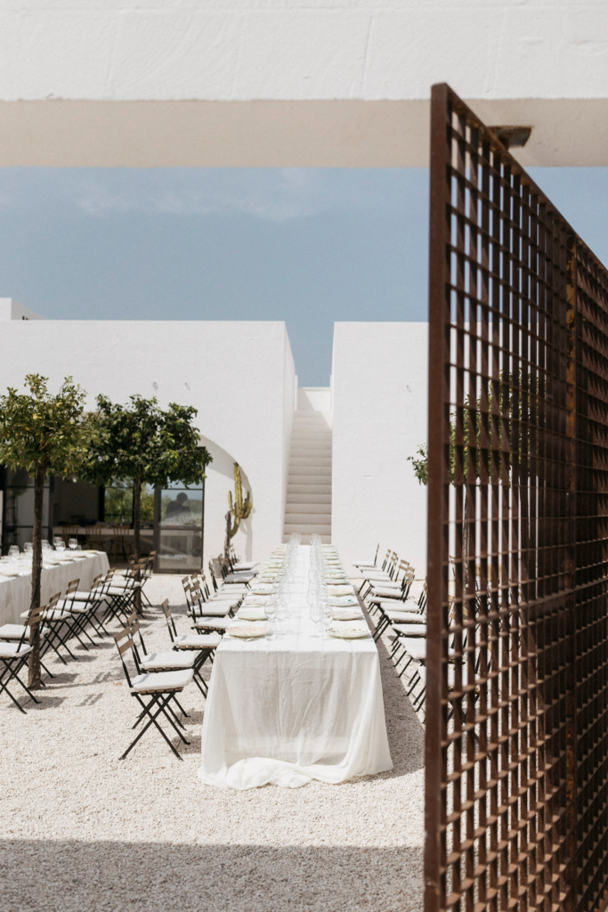Following the ceremony, guests are welcomed into a sleek and stylish masseria that effortlessly fuses traditional Puglian charm with contemporary design. The interior features minimalist decor, clean lines, and a neutral color palette that accentuates the venue’s inherent elegance. Each detail, from the avant-garde lighting fixtures to the chic table settings, reflects a commitment to modern aesthetics.