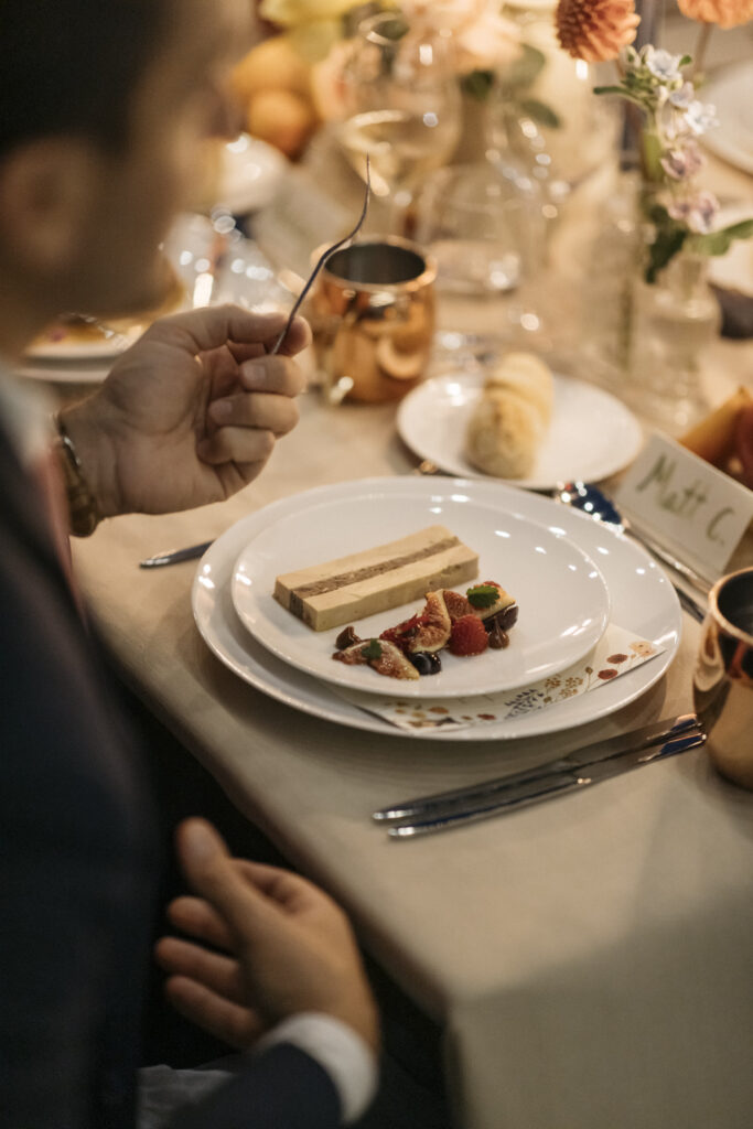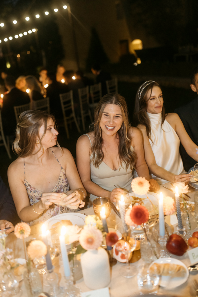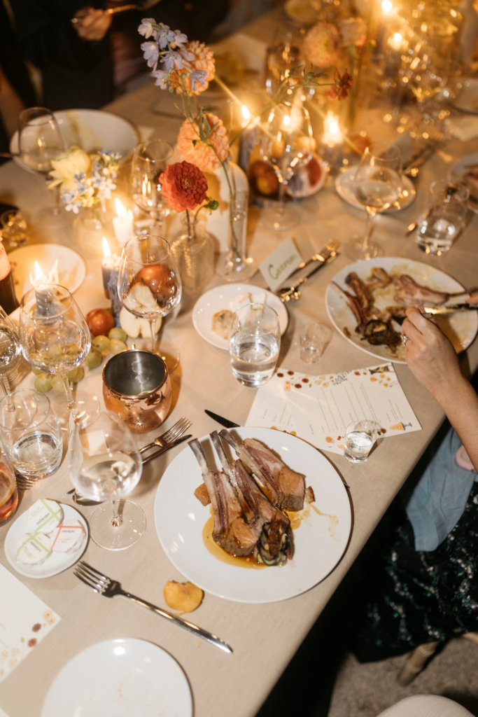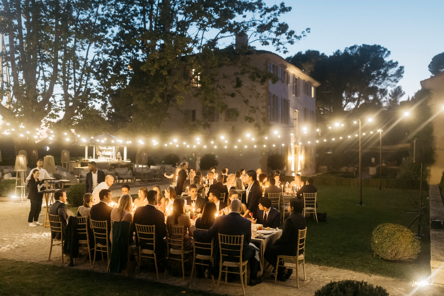 As the sun began to set, guests gathered around long, wooden tables adorned with minimalistic greenery and flickering candles. The al fresco dinner celebrated local flavors with a farm-to-table concept, enhancing the rustic charm with a modern twist. Laughter and conversation flowed freely as guests enjoyed the organic Provencal cuisine.