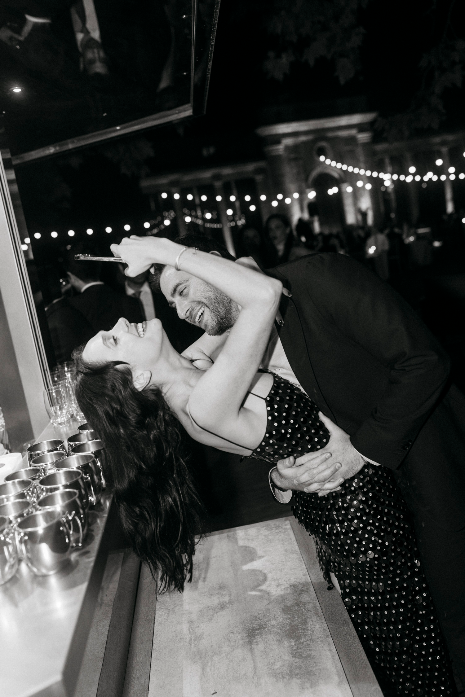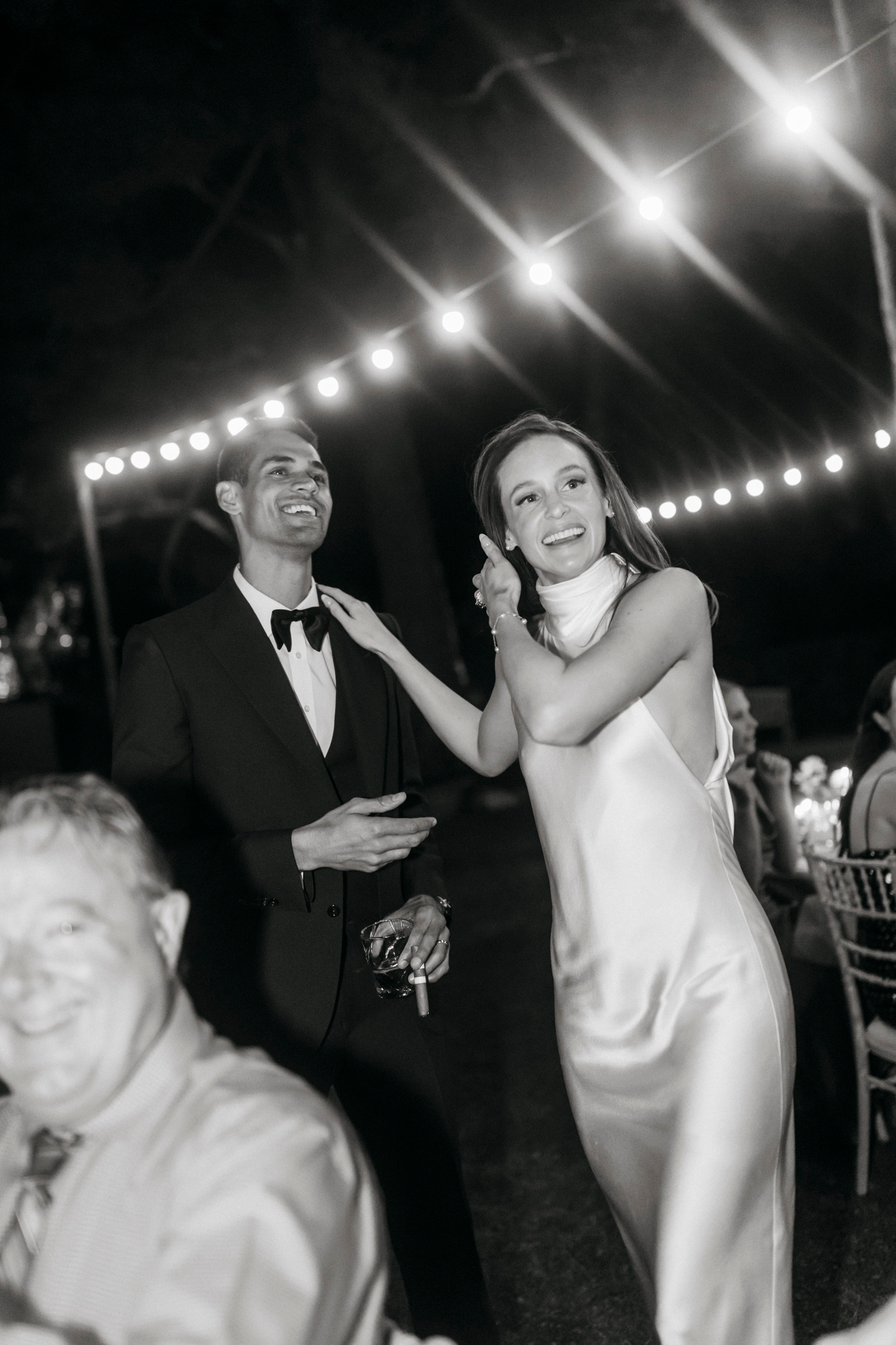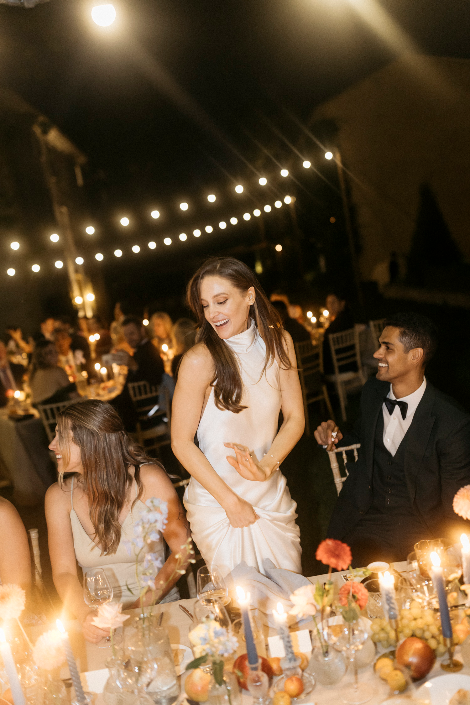 With the transition to the evening, the celebration took on an enchanting ambiance. String lights twinkled overhead, casting a warm glow on the dance floor. The couple, surrounded by loved ones, started an impromptu dance around the tables, creating an infectious energy that encouraged guests to join in. The air was filled with joyous laughter and the rhythmic beat of feet dancing on the grass.